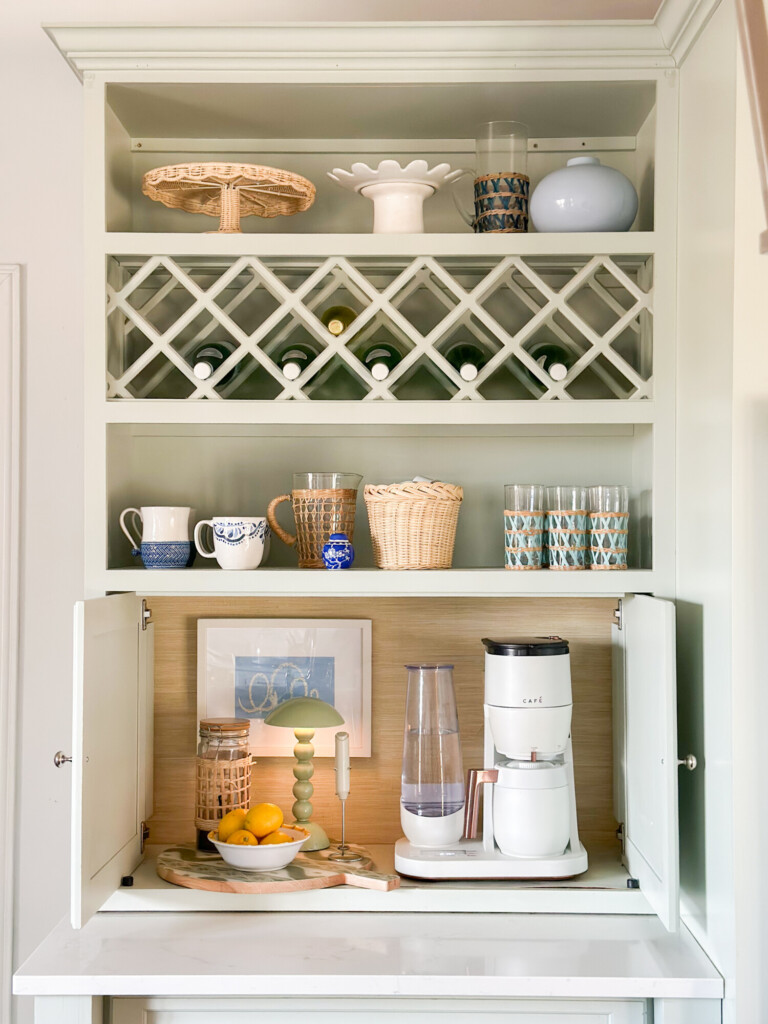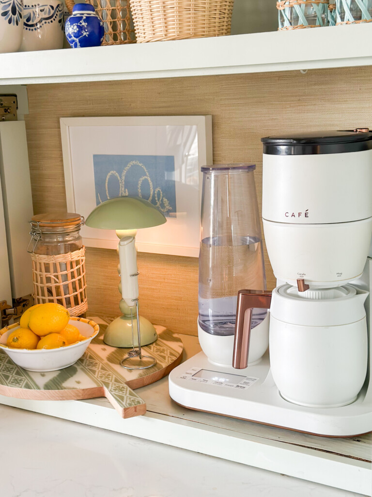 It doesn’t need to be large or complicated, just organized and thoughtful. Keeping everything conrainted on a tray or board instantly makes it feel more pulled together while also making mornings easier. Coffee grounds or pods in stored in a pretty basket or container keep things accessible without looking cluttered.