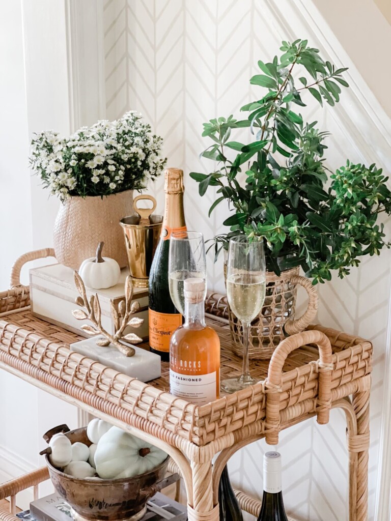 I used to try to play bartender while hosting — and I’d always end up behind the counter instead of at the table. Now, I always set up a little drink station before anyone arrives. It might be as simple as a pitcher of a signature cocktail (think citrusy spritz or sangria), a few bottles of sparkling water, wine, and pretty glasses arranged on a tray.