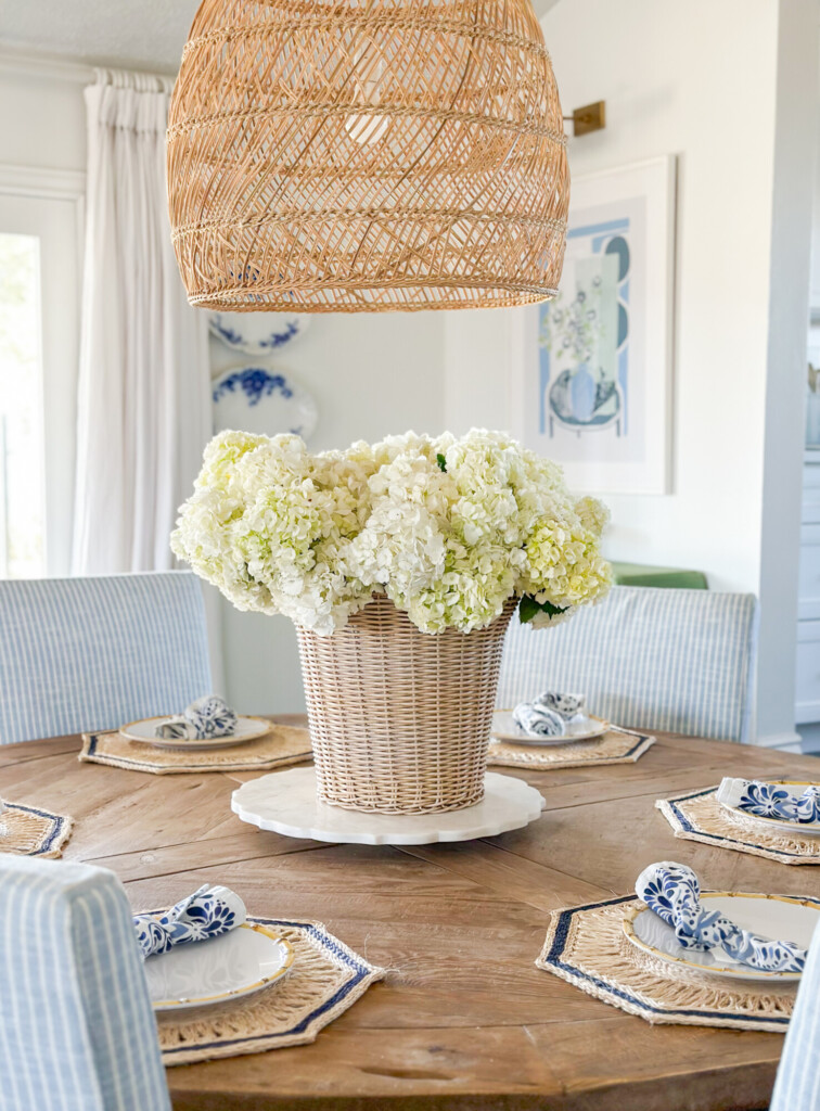 Even when I don’t have time to cook until the last minute, I always set the table early. Flowers, candles, cloth napkins, a few personal touches — these little details instantly make a space feel intentional. I often use what I already have: a woven runner, bud vases with whatever flowers are in season, and low lighting.